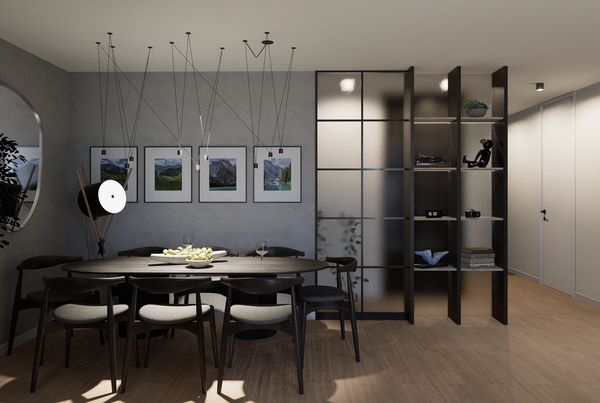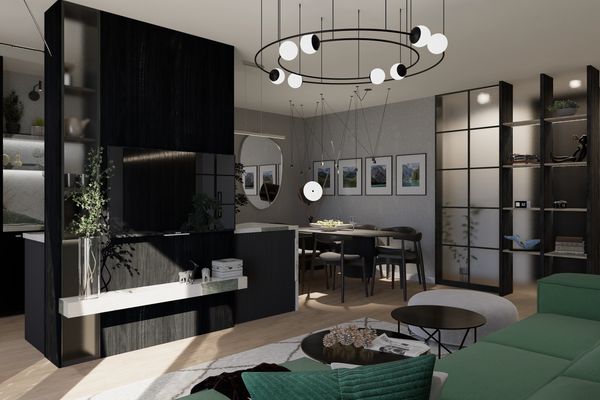 Stan ima 84m2. Prva stavka kada je projekat došao do nas je bila dispoziciona promijenjen u odnosu na originalni prijedlog za izvođenje. Bez obzira na izazove koji su postavljeni konstruktivnim elementima koji prolaze kroz stan (stubovi - betonsko platno, itd) finalna osnova je uspješno izmijenjena i organizovana prema klijentovim stvarnim potrebama. Estetike je takodjer prolagodjena klijentovim željama za tamnijm bojama i razigranom atmosferom